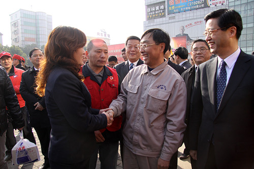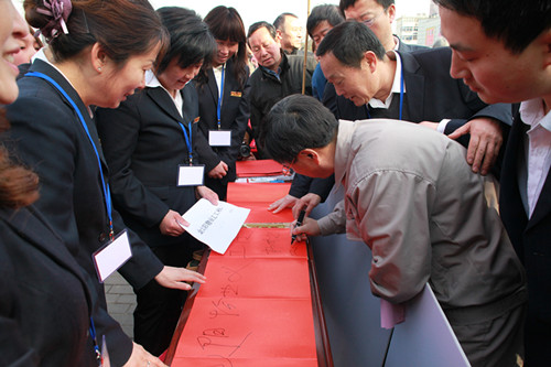 3月3日上午,“當(dāng)代雷鋒”郭明義來到馬鞍山,為郭明義愛心團(tuán)隊(duì)馬鞍山分隊(duì)授旗。盡管行程很緊湊,但郭明義還是給金太陽物業(yè)公司義工社題字,并與董事長朱曉梅親切交談,表示應(yīng)當(dāng)將“當(dāng)代雷鋒”精神在鋼城繼續(xù),在金太陽物業(yè)公司義工社繼續(xù)。金太陽物業(yè)公司義工社參與“郭明義愛心團(tuán)隊(duì)”授旗儀式