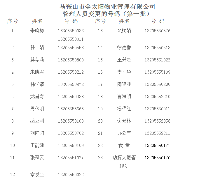 近日,我公司對管理人員聯(lián)系電話進行了更新,小號使用6位數(shù),88+后6位數(shù)。原來使用的聯(lián)通號碼不變,原使用的電信號碼保持到年底。特此通知。