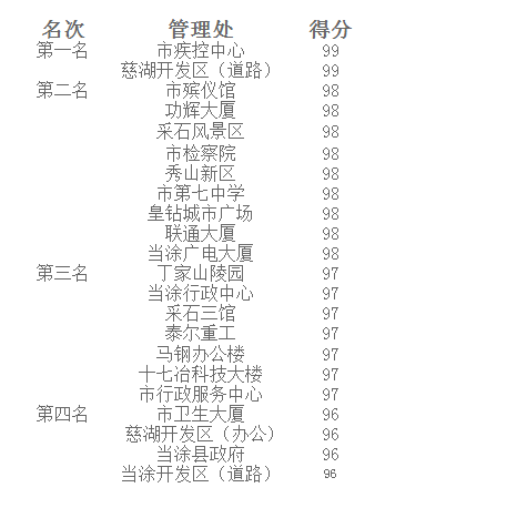 在結(jié)合公司考核小組的月檢,以及綜合業(yè)主單位的反饋意見的基礎(chǔ)上,對各管理處綜合評分,最后經(jīng)總經(jīng)理第48次辦公會議通過,現(xiàn)將有關(guān)管理處綜合考核結(jié)果通報(bào)列表如下: