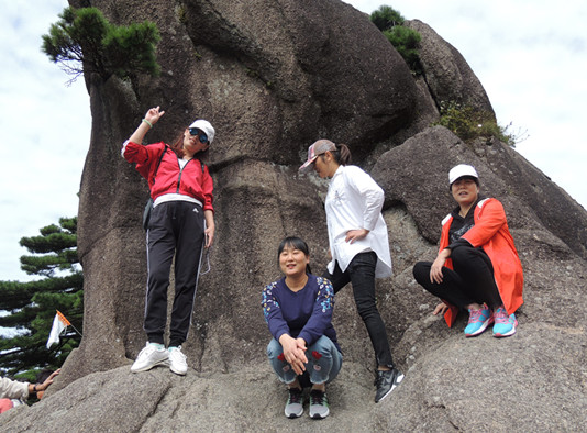 在下索道后,隊(duì)伍所有人立即被眼前美景所吸引,迫不及待掏出相機(jī)、手機(jī)互相攝影留念。在經(jīng)過(guò)短暫的停留與整頓后,旅行隊(duì)繼續(xù)前行,徒步經(jīng)蓮花峰、天都峰,以及“蓬萊三島”、“百步云梯”、“一線(xiàn)天”、“新一線(xiàn)天”、“鰲魚(yú)洞”等諸多景觀(guān),歷時(shí)三個(gè)多小時(shí)攀爬,隊(duì)員們的體力基本已消耗殆盡,甚至個(gè)別隊(duì)員的腿部肌肉因疲勞酸痛而不由自主地發(fā)抖,然而在這種情形下,沒(méi)有金太陽(yáng)人肯輕言放棄,只因心中還有目標(biāo),大家相互攙扶,彼此鼓勵(lì)著繼續(xù)前進(jìn),終于登上了海拔1841米的黃山玉屏景區(qū)的第一高峰——光明頂。