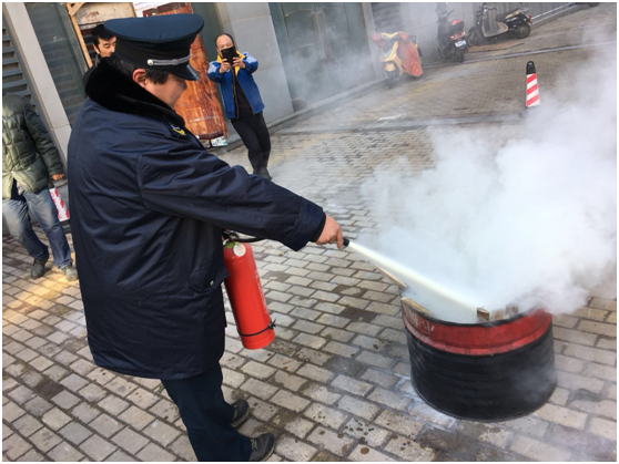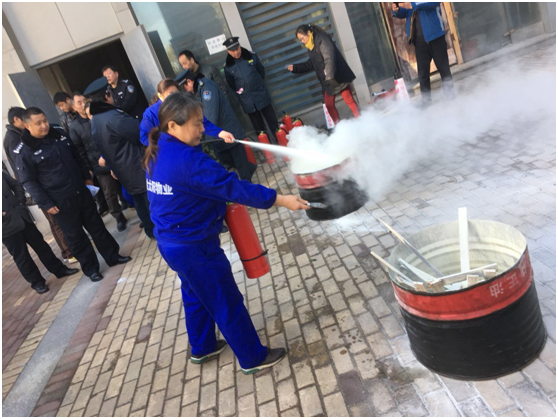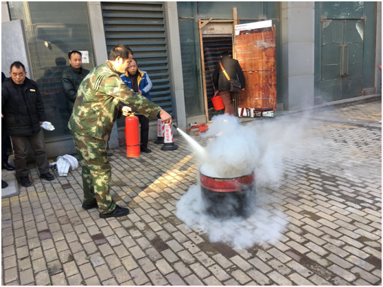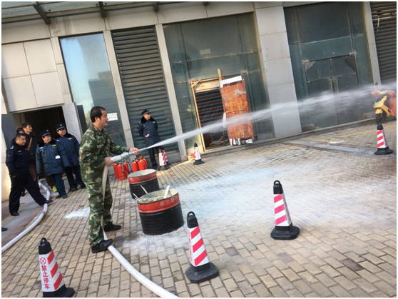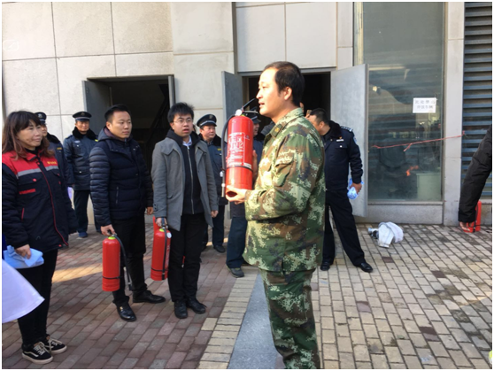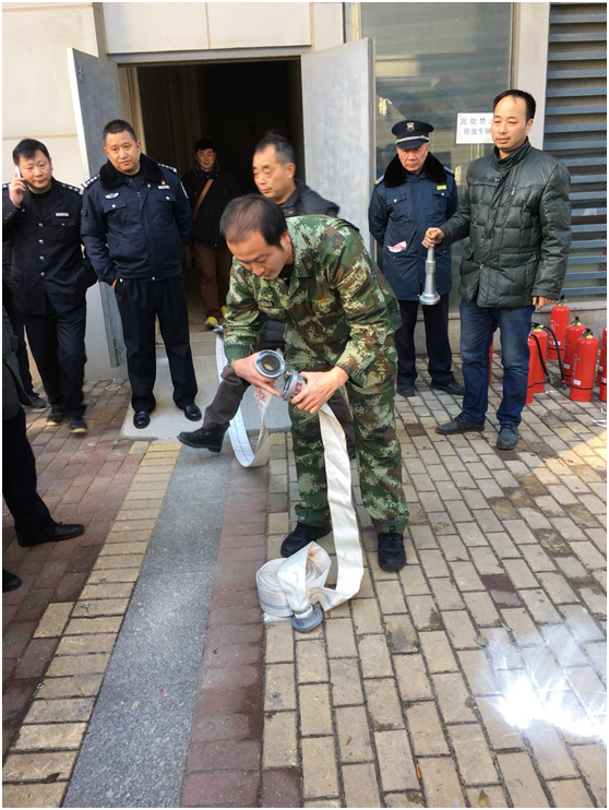 1月9日下午2:30疏散演練正式開始,突然警鈴響起,在物業(yè)管理人員有序引導(dǎo)下部分人就近拿滅火器,部分人參與八樓人員疏散。按消防講座要求,用毛巾捂住口、鼻,疏散通道逃生至一層外空地。消防人員接到報(bào)警后,說明單位名稱地點(diǎn)、著火位置。幾分鐘后消防人員拿滅火器、水槍、水帶找到消防栓接水槍,對(duì)準(zhǔn)火點(diǎn)撲滅,待火撲滅后,一人下樓,匯報(bào)火警已解除。