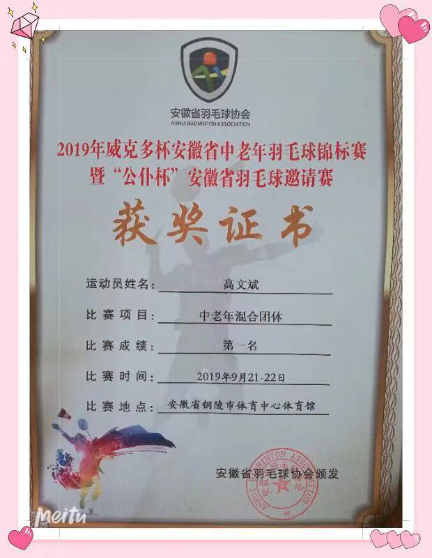日前,從安徽省羽毛球協(xié)會(huì)傳來喜訊,我公司職工高文斌榮獲2019年“威克多杯”安徽省中老年羽毛球錦標(biāo)賽暨全省“公仆杯”羽毛球邀請(qǐng)賽中,奮力拼搏,奪得“中老年混合團(tuán)體第一名”桂冠。