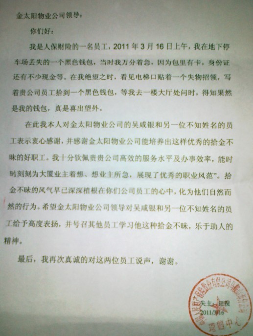 3月16日,我公司功輝大廈管理處保安吳咸銀拾金不昧,及時歸還,受到業(yè)主好評。以下是失主寫的表揚(yáng)信: